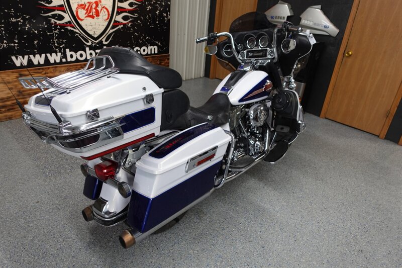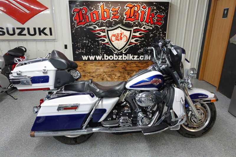 A lot of Harley for the price. This Ultra Classic is dressed in White Gold Pearl & Deep Cobalt Pearl. Equipped with Rinehart exhaust, aftermarket intake, Sony head unit with AM/FM/Bluetooth, taller bars, aftermarket speaker pods in the lowers and trunk, Road King seat, highway pegs, LED headlight & driving lights, and cruise.