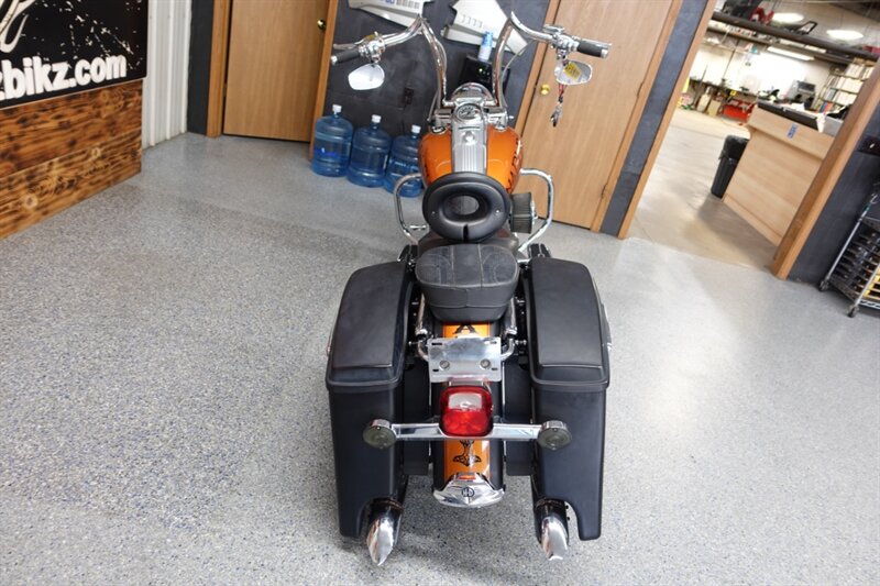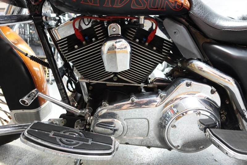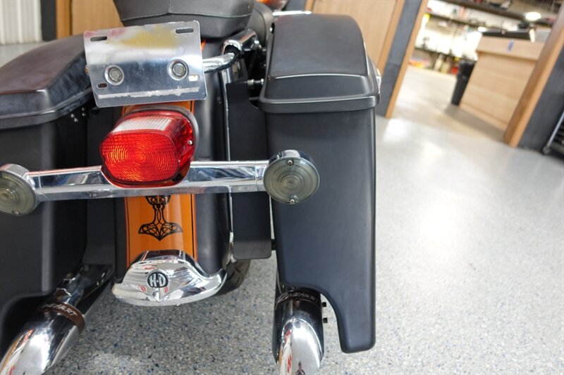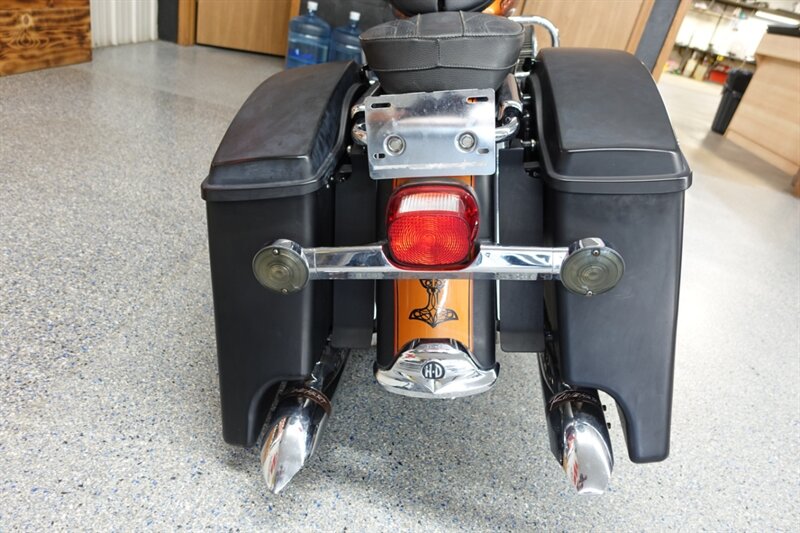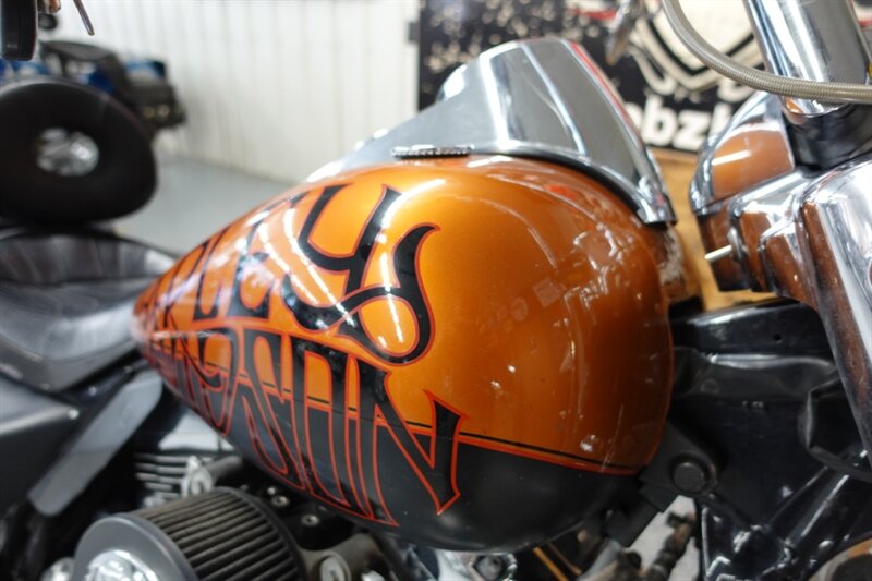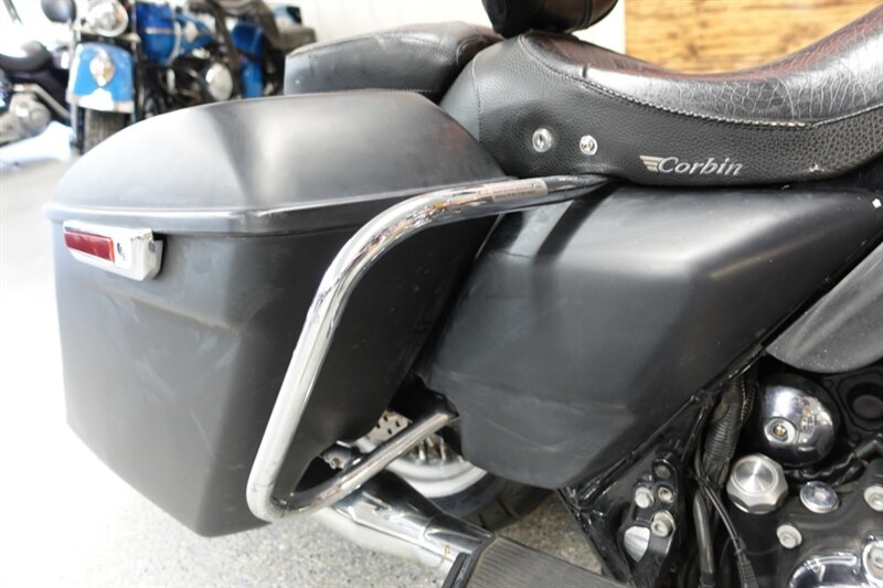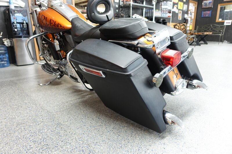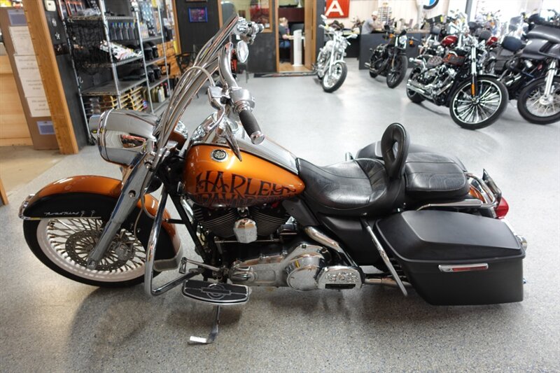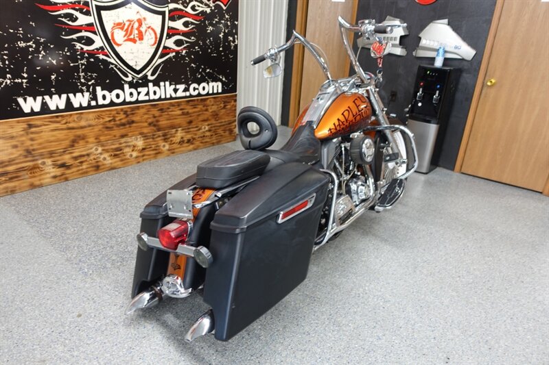 Loaded Road King Classic that runs and rides! Equipped with air ride, fatty spoke wheels, taller handlebars, dual headers with Rinehart slip ons, aftermarket intake, Corbin seat with driver backrest, stretched newer model saddlebags, and cruise. This bike has some motor work with compression releases, but we do not have the paperwork on it.