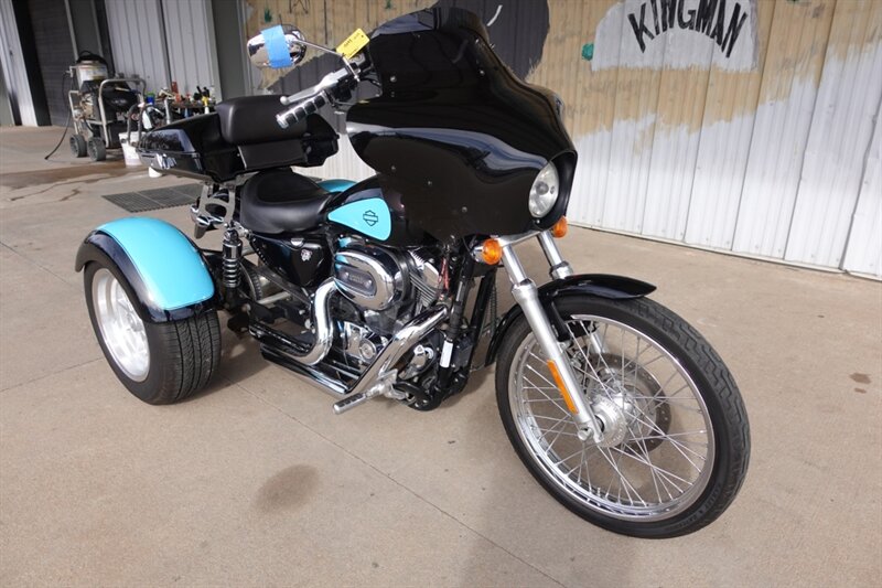 Budget trike! The ONLY reason we are selling this machine AS-IS is due to a salvage title. It's a really clean Sportster 1200 with a Frankenstein trike kit. The custom paint makes it pop and the larger tank lets you go for longer rides. Added quick detach low profile top trunk that acts as a driver backrest too, Mustang solo seat, quick detach fairing, and strong sounding Vance & Hines exhaust.