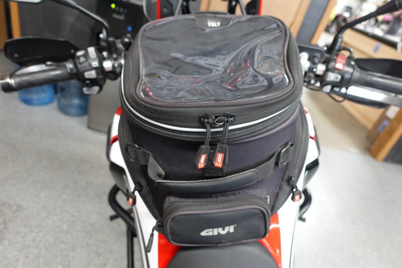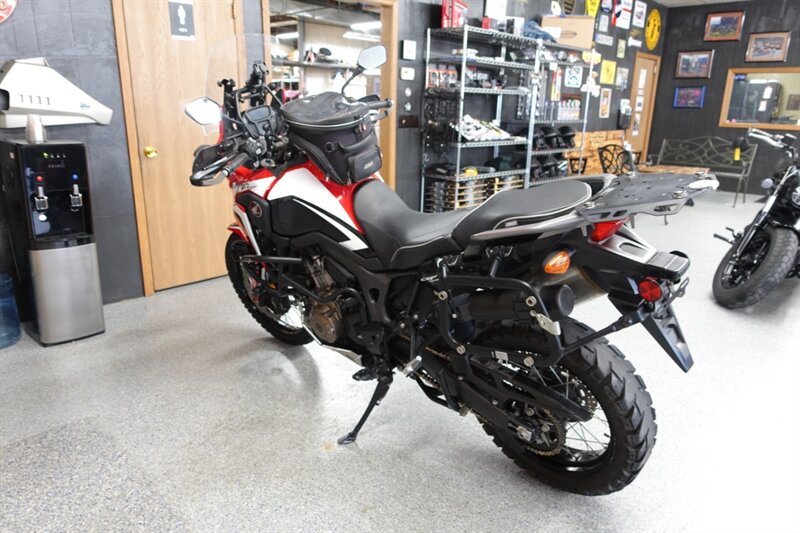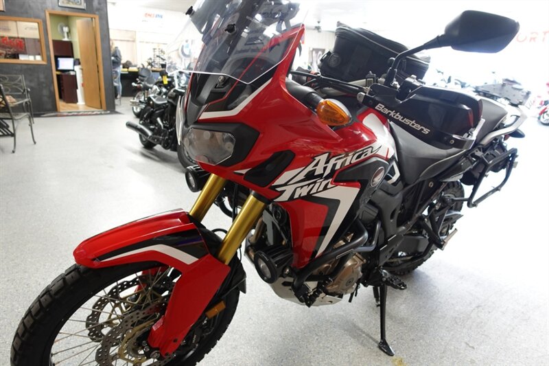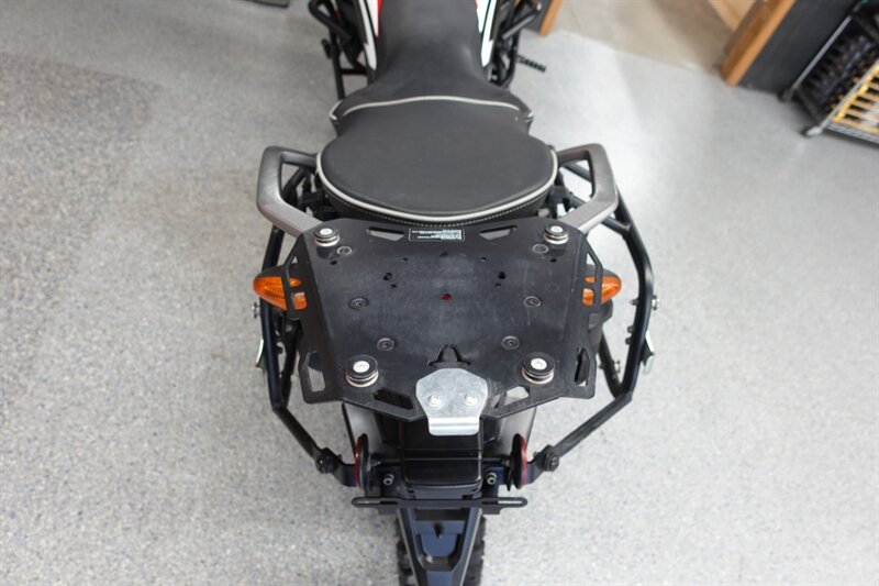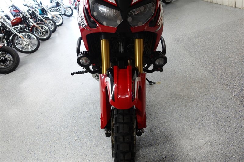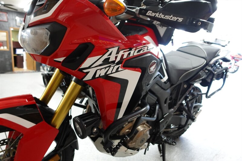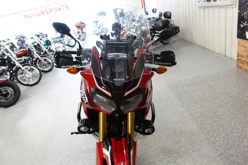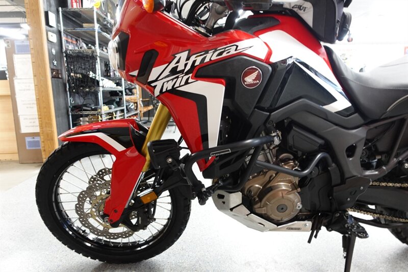 Budget friendly Africa Twin DCT (fully automatic) and man is this thing loaded! Sargent seats, luggage rack, saddlebag mounts, Givi tank bag, Denali auxiliary lights, Madstad windshield, headlight covers, Barkbusters handguards, highway pegs, dry container, heated grips, and ABS. Also has engine guards, pegs, and skid plate all by SW-Motech.